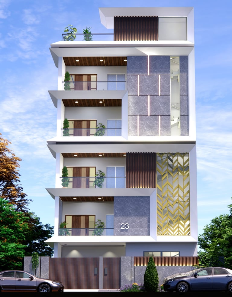 A sleek vertical retreat that merges urban sophistication with natural serenity. The Duplex stands out with its bold geometric form, refined material palette, and balanced symmetry. The façade features a blend of grey stone, warm wooden textures, and golden metallic screens that add depth and elegance. Layered balconies with planters soften the modern lines, while ambient lighting highlights the structure’s vertical rhythm. Designed for modern living, it embodies openness, luxury, and a seamless connection to nature — even within an urban skyline.