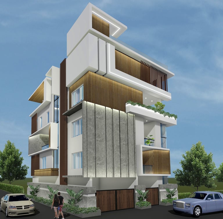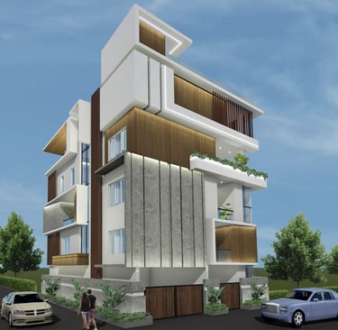A contemporary urban residence that balances elegance and functionality. The design features clean horizontal lines, warm earthy tones, and textured stone cladding that add depth to its façade. Expansive balconies, subtle lighting, and green inserts create a refined modern aesthetic. The rooftop terrace offers an open leisure zone, making statement of modern comfort and timeless sophistication.