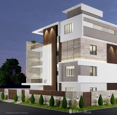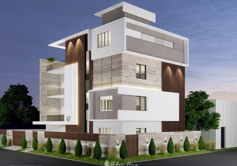 A striking blend of modern symmetry and natural texture, Residence stands as a bold architectural statement of sophistication and balance. The design harmonizes clean white volumes with stone finishes and rich wooden vertical elements, creating depth and contrast. Layered planes, subtle lighting bands, and sleek corner detailing give the façade a dynamic yet composed character. Thoughtfully designed for contemporary living, this residence embodies urban elegance — where simplicity, material richness, and spatial clarity come together in perfect harmony.