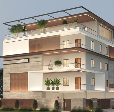 A refined composition of elegance and geometry, Residency captures the essence of modern minimalism with a warm, organic touch. The design features clean horizontal planes, soft neutral tones, and textured stone cladding that ground the structure in timeless sophistication. Accented with natural wood finishes and cascading greenery, each level opens up to light-filled balconies that blur the boundary between indoors and outdoors. The rooftop garden and linear lighting enhance its serene ambiance, making Residency a sanctuary of comfort, luxury, and contemporary grace.