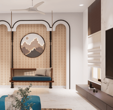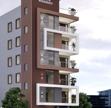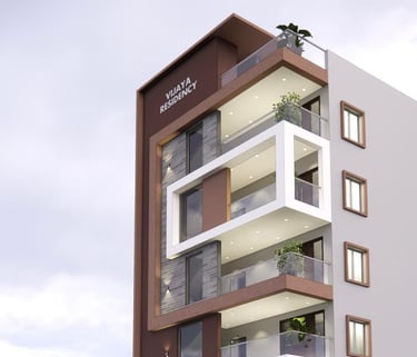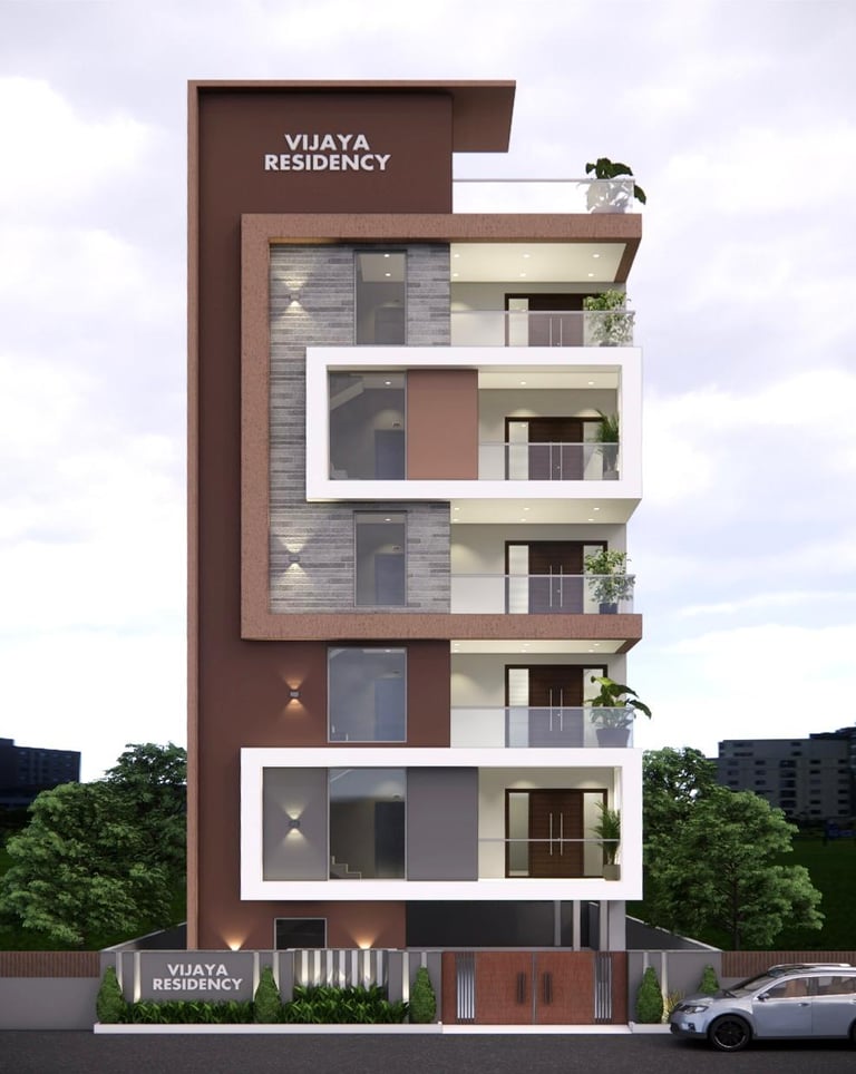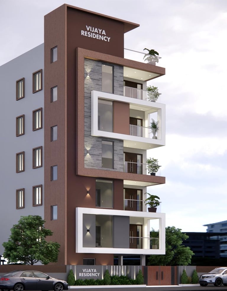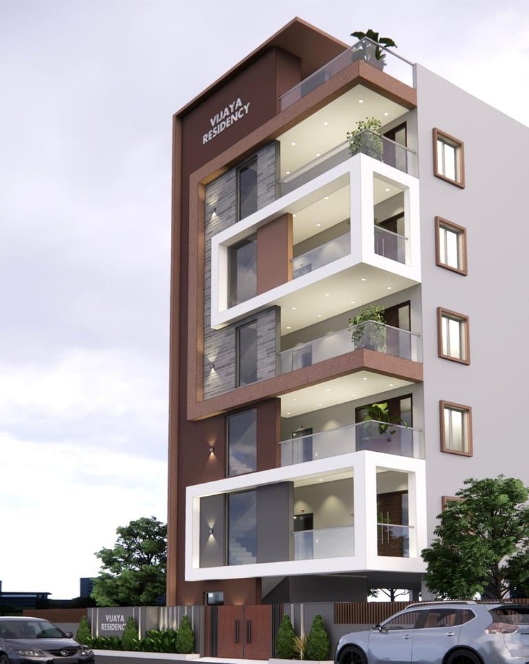 Vijaya Residency combines minimalistic design with bold architectural framing. The façade features striking rectangular projections, textured stone cladding, and earthy tones that add warmth and depth. Each balcony is thoughtfully designed to offer openness and privacy, enhanced by greenery that softens the structure’s clean lines. With its contemporary geometry, elegant material palette, and vertical elegance.